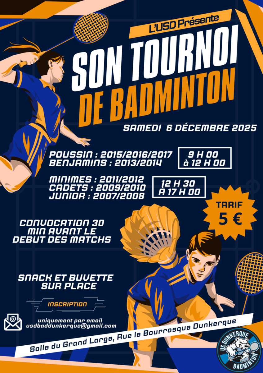 L’USD a le plaisir de vous inviter à son tournoi de badminton, qui se tiendra le samedi 6 décembre à la salle du Grand Large, rue le bourrasque. Le tournoi débutera le matin avec les poussins et les benjamins, de 9 heures à 12 heures. L’après-midi sera réservé aux minimes, cadets et juniors, de 12 h 30 à 17 heures. Poussin : 2015/2016/2017 Benjamin : 2013/2014 Minime : 2011/2012 Cadet : 2009/2010 Junior : 2007/2008 Merci de renseigner votre nom, prénom, club et catégorie lors de votre inscription, un joueur peut être surclassé. Date limite d’inscription le dimanche 30 novembre. Chaque joueur recevra un lot à l’issue de sa participation. Nous vous rappelons qu’il est nécessaire d’arriver 30 minutes avant le début des matchs afin de valider votre convocation. Une buvette ainsi qu’un espace snack seront disponibles sur place tout au long de la journée. L’inscription se fait uniquement par email à l’adresse suivante : usdbaddunkerque@gmail.com. Le tarif de participation est fixé à 5 € à régler le jour de votre arrivée. Nous espérons vous retrouver nombreux pour partager ensemble cette belle journée sportive et conviviale ! Voici notre affiche ci jointe pour la diffuser auprès de votre club N’hésitez pas à nous contacter pour toute autre question ! Sportivement